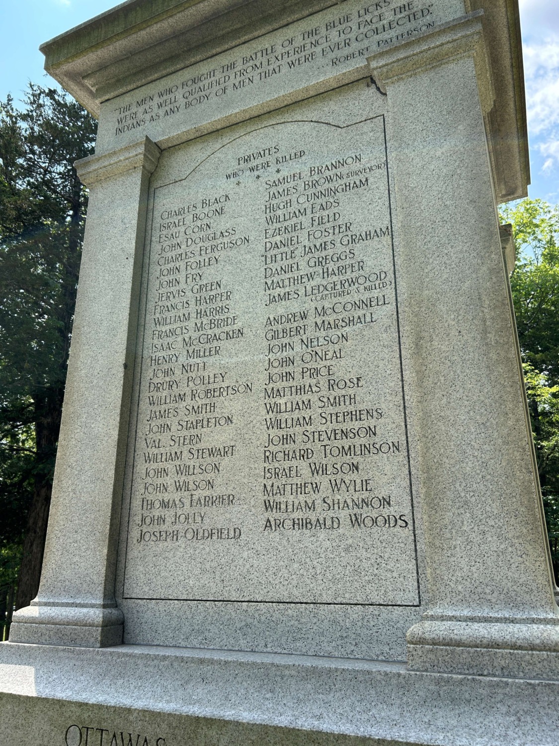 Today Blue Licks State Park preserves the battlefield and has a reenactment of the battle every year on the weekend closest to August 19. Tom and I admired the main monument, which listed the names of all the militia who were killed, wounded, or captured during the battle. We wanted to visit the Pioneer Museum but it is closed on Tuesdays.