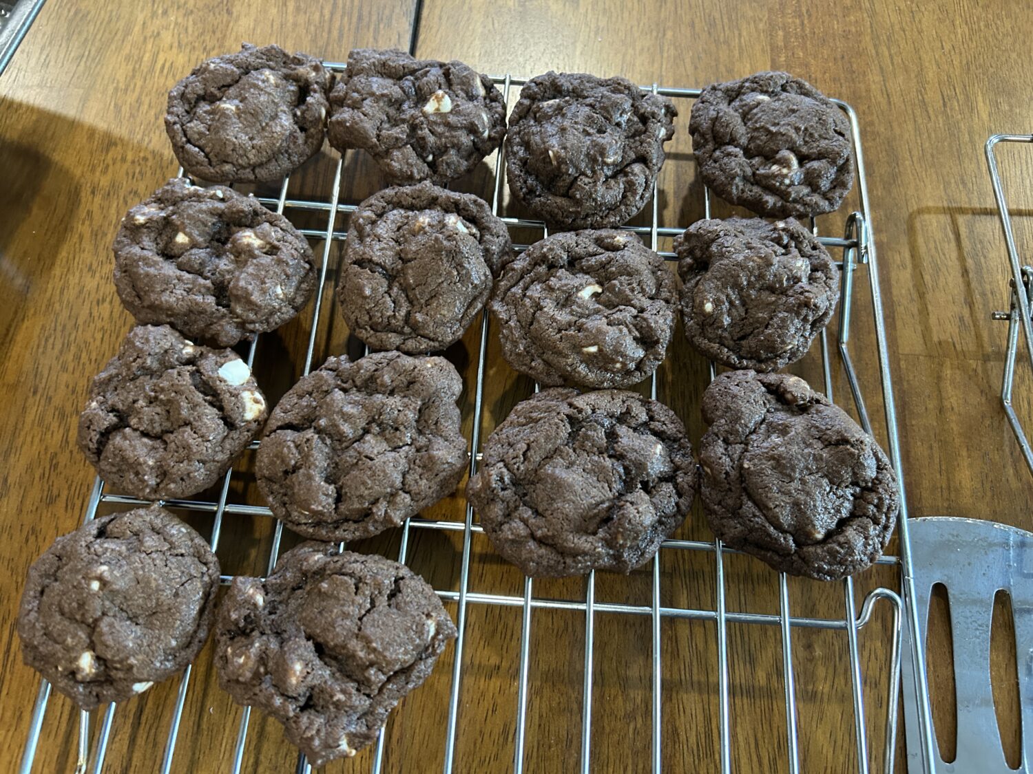 I made five batches of White Chocolate Chip Cookies for the church Cookie Walk. Then I made five batches of Reese’s Chewy Chocolate Cookies, also for the church Cookie Walk. These two cookies look exactly alike except one has white chocolate chips and one has peanut butter chips.