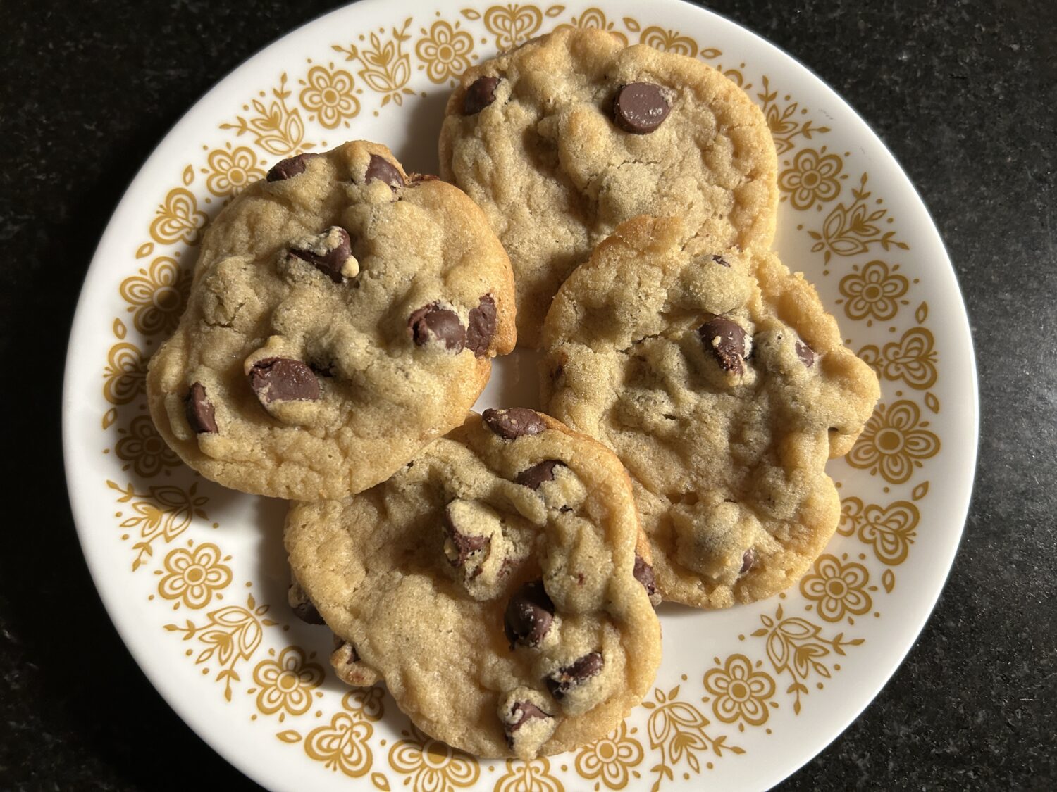 My dad asked for Dad and Tom liked them a lot.. Mom is the Chocolate Chip cookie queen, but she doesn’t make cookies anymore. So I used her recipe and hoped for the best. Mom’s recipe, at one time, was the one on the back of the Nestle Chocolate Chip bag, but it uses shortening, and the bag recipe uses butter. I used a mix and the cookies were very similar to what she made. Dad and Tom liked them a lot.