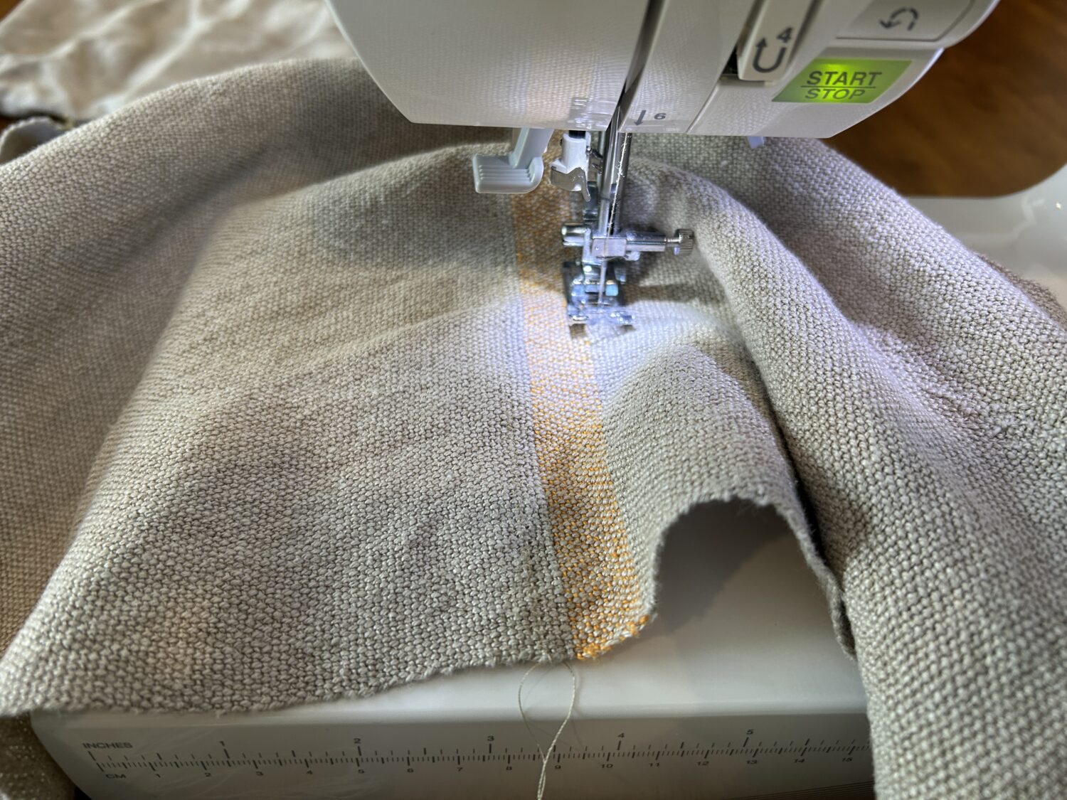 The problem with handweaving material is that you don’t want to cut it apart. At least I didn’t. It looks so lovely as a single piece of cloth. It took me until last week to finally get up the courage to begin sewing the haversack. First, I measured and marked the dimensions on the cloth. The haversack is 18″ deep and 15″ wide. The strap is 4″ wide and 38″ long. I decided to use the striped fabric as a lining in the bag to make it stronger. And that gave me enough left over to line the flap with the plain fabric.