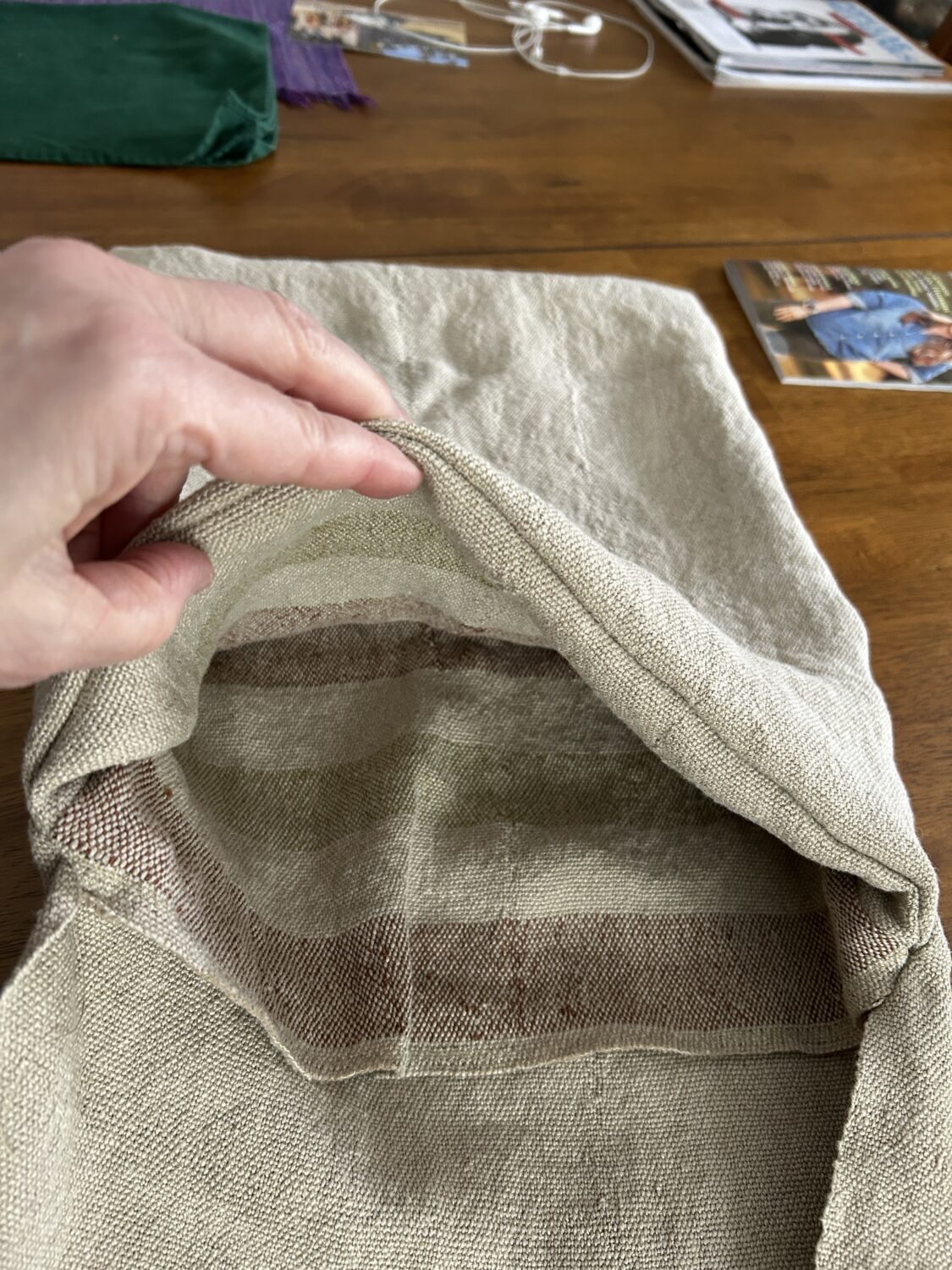 Tom bought a linen haversack, suitable for 18th century living history. He uses it so much and carries so much in it, that it is looking pretty scruffy. When I learned how to weave, I decided to make him another haversack. I bought the linen yarn – and then did nothing with it. During Covid, I tried weaving with linen and it was such a disaster that I didn’t think I would do it again. But linen yarn is expensive and I didn’t want to waste the yarn I had already bought.