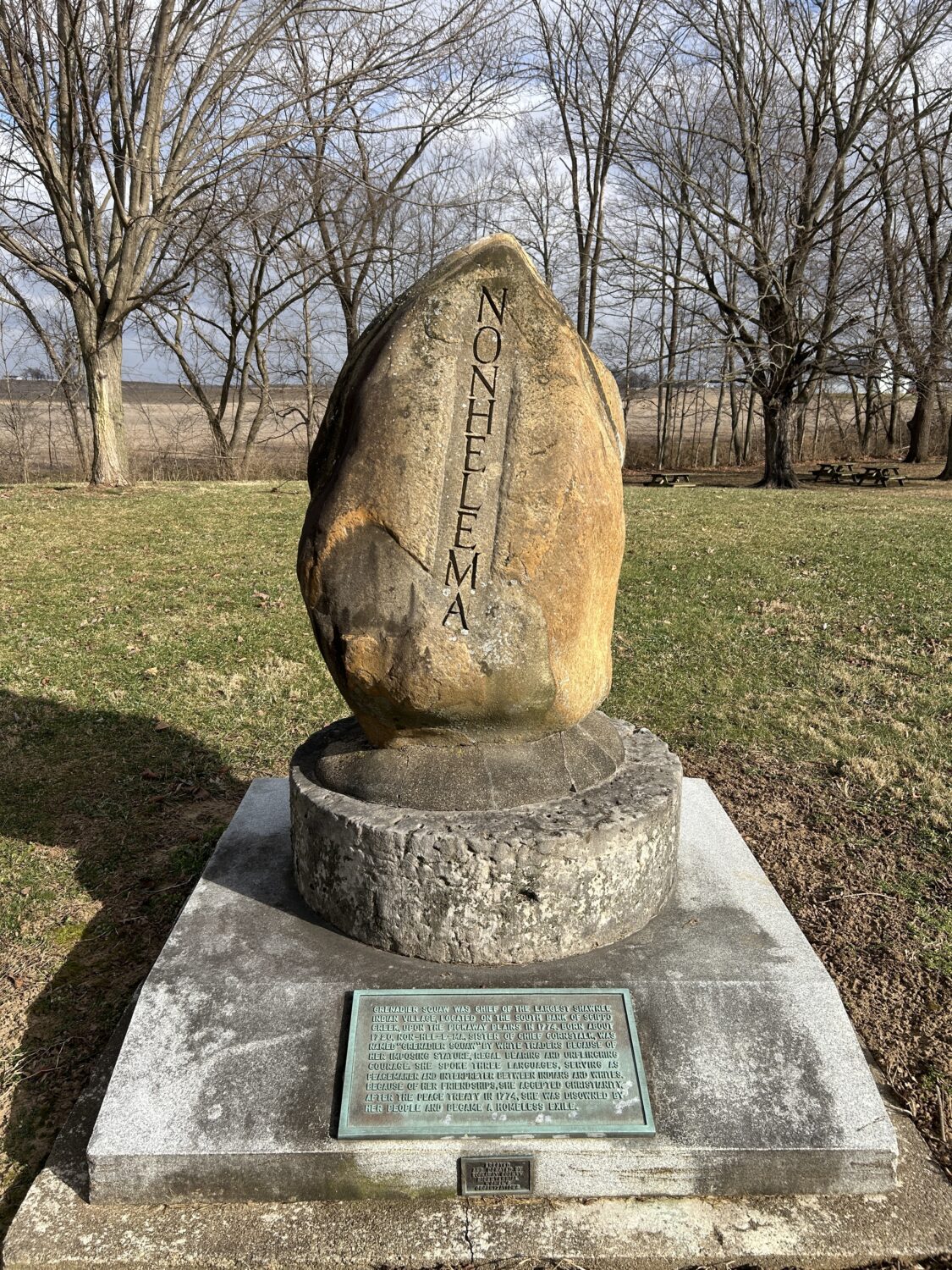 The memorial park also has plaques and markers dedicated to other native leaders and to revolutionary war leaders. Nonhelema, also called Grenadier Squaw, was the chief of the largest native village in the area. Despite her support of the United States and her refusal to side with the British during the Revolutionary War, her village was attacked and destroyed shortly after the war ended.