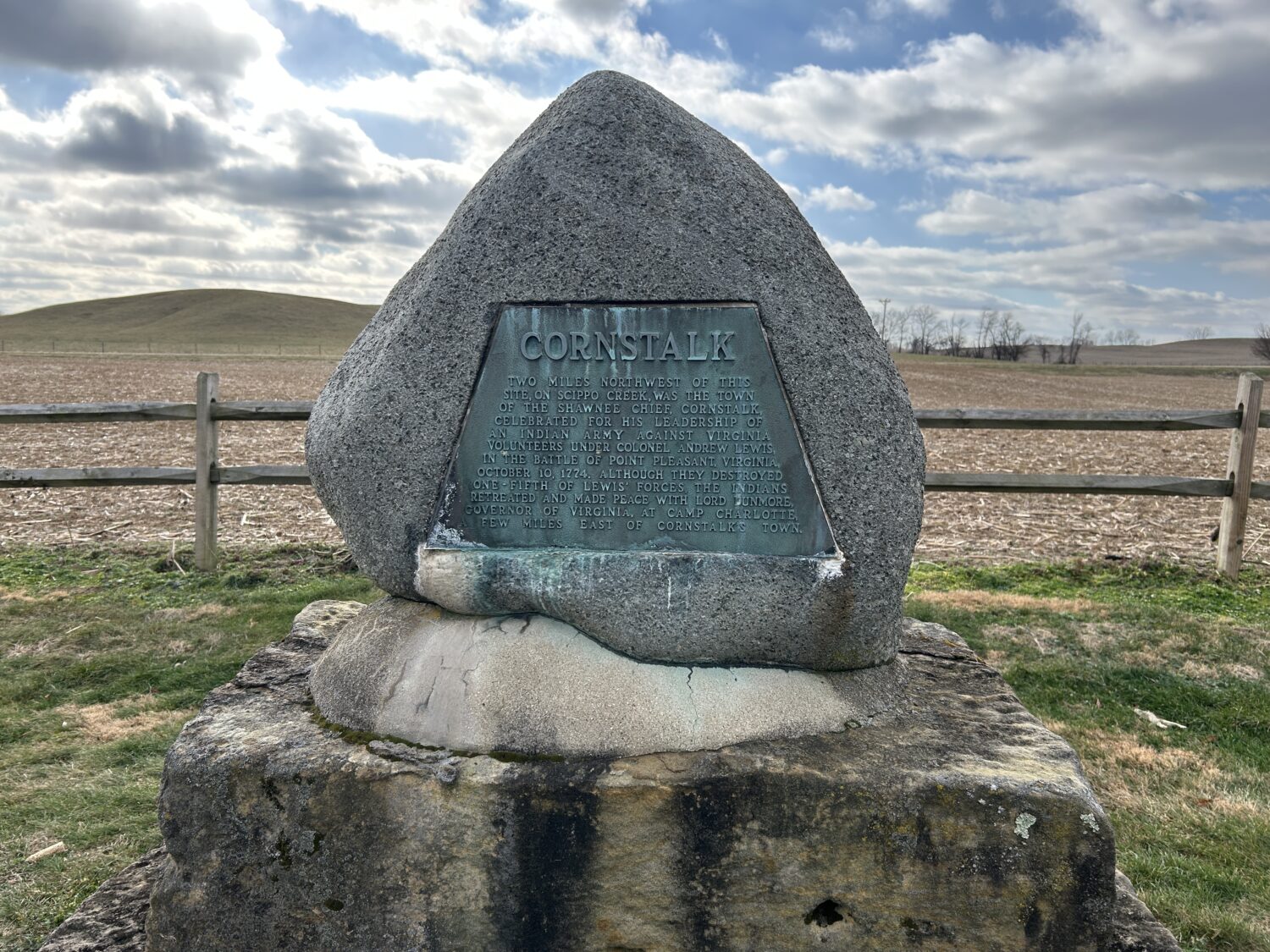 Another memorial is to Chief Cornstalk, the primary Shawnee chief during Lord Dunmore’s War. His murder, during a diplomatic visit to Fort Randolph, caused many Shawnee to join the British side in the American Revolution.
