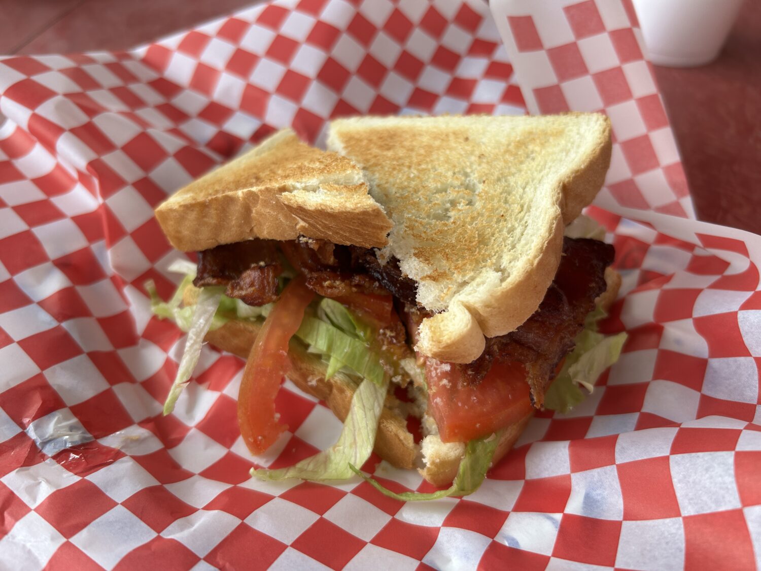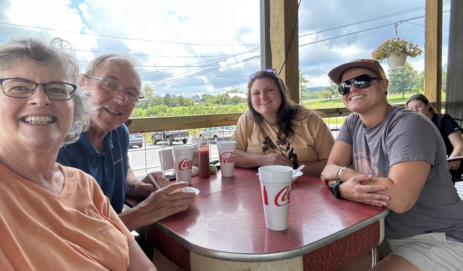 I ordered a BLT, Tom and Chandler got chicken salad, and Olivia got a cheeseburger. Tom and I also shared some fries. My BLT was delicious with garden-ripe tomatoes and bacon fried just right. When we were looking at the menu, Chandler and I both noticed the dessert special – homemade peach cobbler. We decided to share some. Tom and Olivia, being more chocolate dessert people, declined. The peach cobbler was delicious. Even Tom and Olivia tried a bite.
