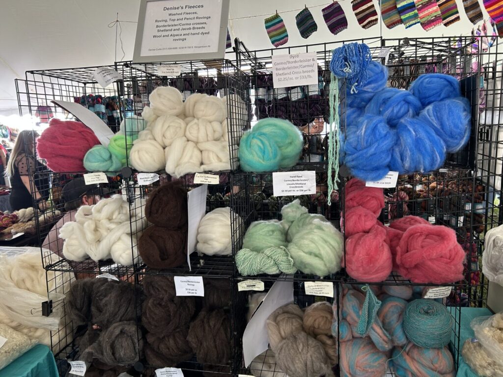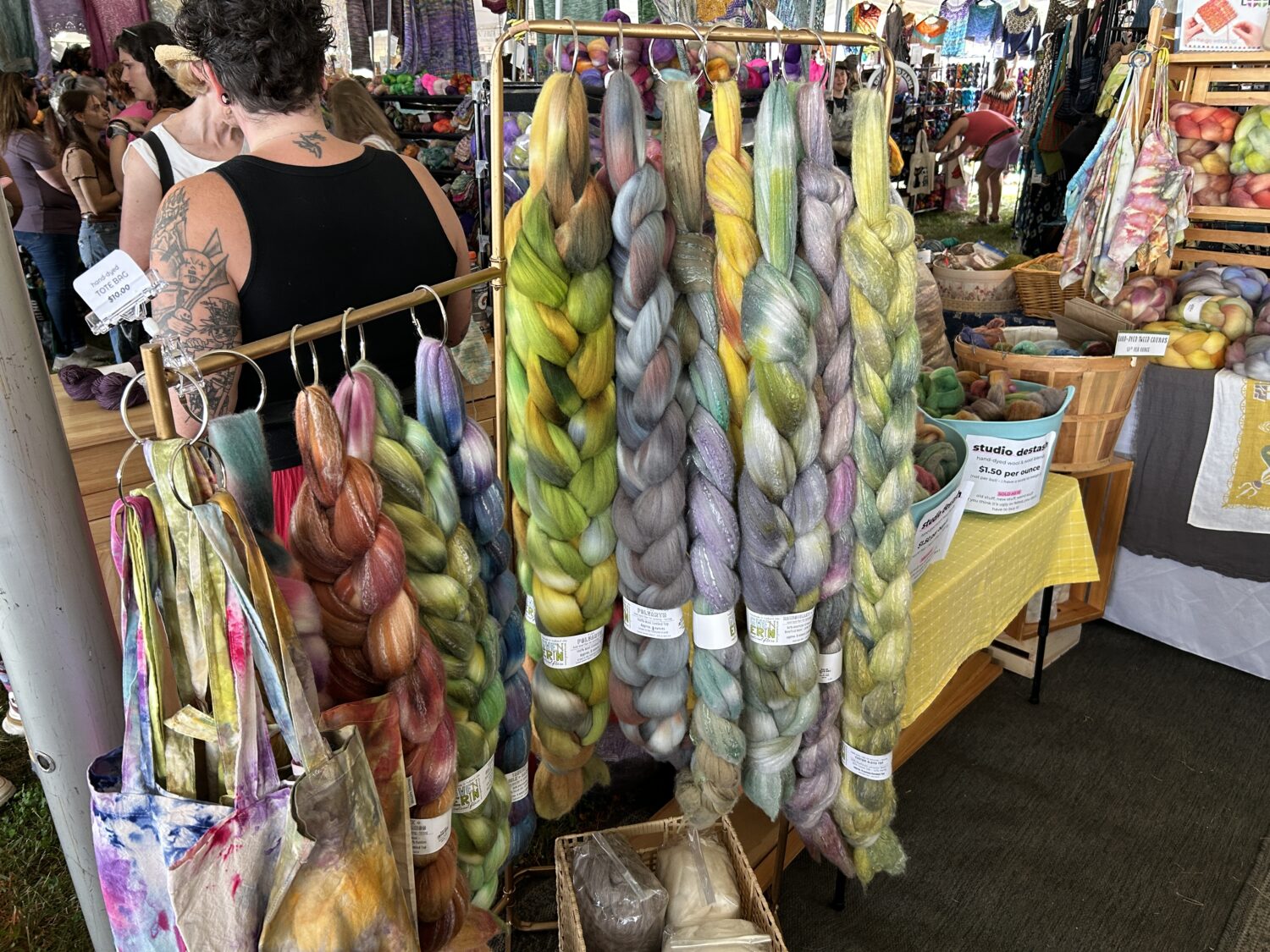 John and Jackie immediately peeled off with Pookah. The tents were too crowded for her. They headed to the more open grassy areas between tents. Tom and I plunged into the first tent and headed down the aisle. So many beautiful yarns! So much gorgeous roving! Fleeces galore! I could have strolled and sampled and spent a ton of money and a lot of time talking to vendors.