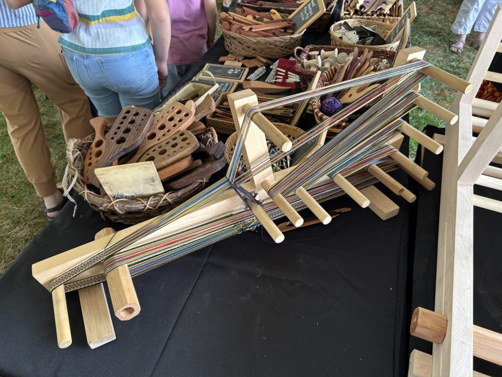 My favorite booth, and one where I could have spent a lot of money, was Fresh Lotus Design from Woodland Beach, Michigan. They had hand-painted braids of roving that were gorgeously dyed in stunning combinations. Probably not period correct, but too beautiful to pass up completely. I bought one braid of Vintage Gold that I could defend as being period-appropriate colors. I would have bought more, but I reminded myself that I only spin when I am demonstrating – I prefer to weave or knit when I am home.